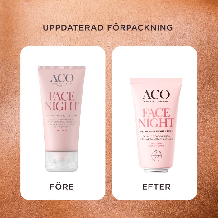ACO Face Nourishing Night Cream är en extra rik och intensivt vårdande nattkräm med urea. Ansiktskrämen återfuktar huden i upp till 24 timmar. En oparfymerad nattkräm som lugnar och reparerar huden medan du sover, och som stärker hudbarriären.