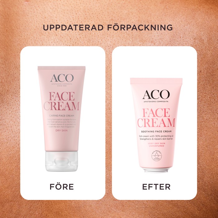 ACO Face Soothing Cream är en extra rik och lugnande ansiktskräm med 30% skyddande olja. ACOs Soothing-kräm återfuktar huden i upp till 24 timmar och ger huden lyster. Ansiktskrämen bidrar till att skydda, stärka och reparera hudbarriären. Går bra att använda under smink. Oparfymerad.