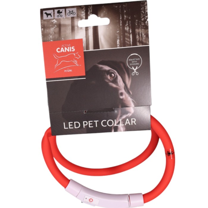 Active Canis LED-halsband är ett blinkande, regntåligt halsband till hunden, som kan lysa med tre olika ljuslägen: snabb blinkning, långsam blinkning och fast sken. Halsbandet laddas upp med hjälp av USB-sladd.