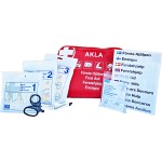 Innehåll Påse 1 - Små sår (art. 91601) - 6 Sårtvättare (art. 94408) - 2 Sterila torkare (art. 96102) - Plåster i olika storlekar Påse 2 - Stora sår (art. 91602) - 4 Sårtvättare (art. 94408) - 2 Sterila torkare (art. 91602) - 2 Skyddshandskar i vinyl (art. 69230) - 1 Sterilt Första Förband 17x17cm (art. 92111) Påse 3 - Mycket stora sår (art. 91603) - 1 Sterilt kombi/tryckförband 20x20cm (art. 92502) - 1 Fixerbindor (art. 78000) - 2 Skyddshandskar i vinyl (art. 69230) Övrigt - 1 Sax 15cm, rostfri (art. 97473) - 1 Andningsduk med backventil (art. 97106) - 1 Folder L-ABC (art. 97457)