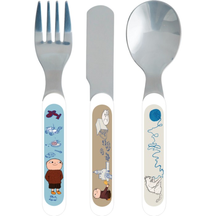 Alfons Åberg tåliga barnbestick i ABS-plast och rostfritt stål. Set med kniv, gaffel och sked som passar små händer och munnar.