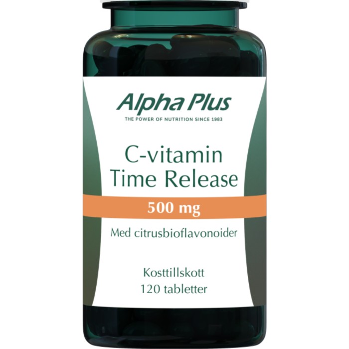 Alpha Plus C-vitamin Time Release 500 mg är ett kosttillskott som innehåller vitamin C med långsam frisättning, vilket gör att kroppen får tillgång till vitaminet under en längre tidsperiod. C-vitamin bidrar bland annat till immunförsvarets normala funktion, minskad trötthet och utmattning samt till att skydda cellerna mot oxidativ stress. Det har även betydelse för nervsystemets normala funktion.