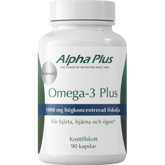 Alpha Plus Omega-3 Plus är ett kosttillskott som innehåller 750 mg omega-3 per kapsel, från VivoMega™ 4030TG, en fiskolja i naturlig triglyceridform med 400 mg EPA och 300 mg DHA. EPA och DHA bidrar till hjärtats normala funktion vid en daglig dos på minst 250 mg. DHA stödjer även normal syn och hjärnfunktion vid samma intagsnivå.