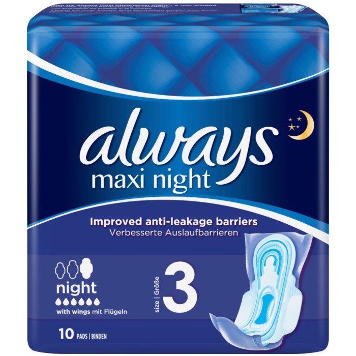 Always Maxi Night bindor ger ett bra skydd på natten och är bekväma att använda. Maxi Night är en tjock sanitetsbinda med anti-läckagebarriärer och en extra absorberande kärna (core+-teknologi). Med unika anti-läckagebarriärerna framtill, i mitten och baktill för att hjälpa till att förhindra läckage, och en extra core+-zon i mitten utformad för att absorbera vätska där det behövs mest.