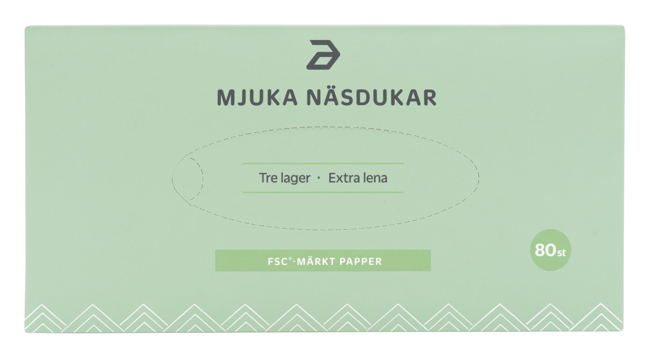 Detta är en förpackning med 80 stycken näsdukar i en box. Näsdukarna är tillverkade av 100% cellulosafiber (FSC-märkt) och är ej klorblekta.