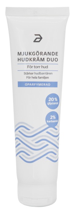Apotea Mjukgörande hudkräm Duo är en återfuktande och mjukgörande kräm framtagen för att återfukta torr hud. Krämen innehåller effektiva fuktgivande ämnen som 2% karbamid och 20% glycerol. Passar både vuxna och barn i alla åldrar med torr hud. Apoteas mjukgörande kräm är oparfymerad och innehåller inga konserveringsmedel.