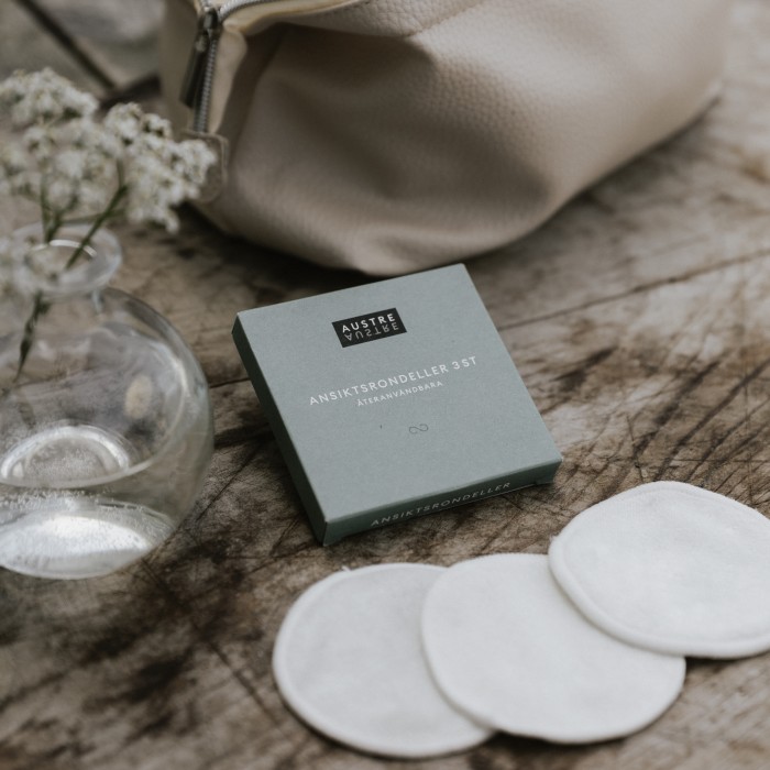 AUSTRE Ansiktsrondeller är ett 3-pack med dubbelsidiga och återanvändbara ansiktsrondeller tillverkade i bambufiber. Rondellerna kan användas för hudvård och för sminkborttagning. Rondellen har en milt exfolierande sida med frotté, anpassad för rengöring, och en sammetslen sida som är anpassad för ansiktsvatten.