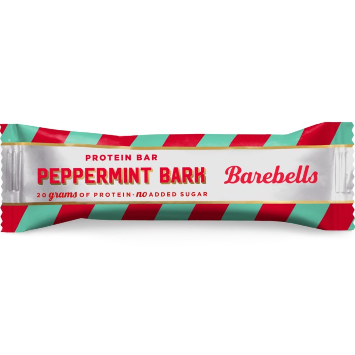 Barebells proteinbar Peppermint Bark är en Limited Edition-bar med ett överdrag av vit choklad (23%) och en smak av polkagris. En bar innehåller 20 gram protein. Innehåller sötningsmedel.