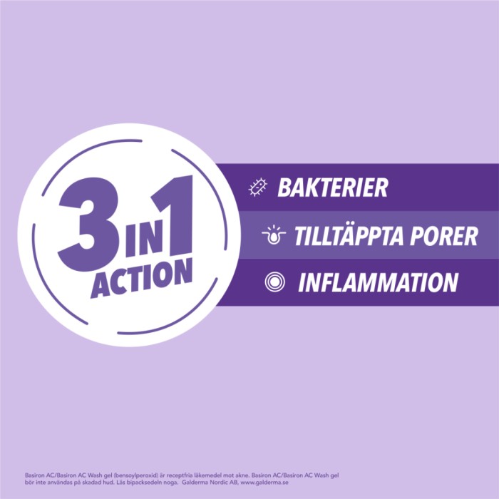 Basiron AC är Sveriges mest sålda receptfria läkemedel mot akne. Basiron AC innehåller bensoylperoxid som har en bakteriedödande effekt på acnebakterien Propionibacterium acnes. Bensoylperoxid ger även avfjällning av huden och därmed avlägsnas det överskott av hornämne som täpper till talgsäckarna.