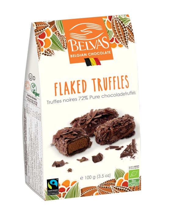 Belvas Flaked Truffles är chokladtryfflar av mörk choklad som tillverkats för hand i Belgien. Alla Belvas chokladpraliner är ekologiska och fairtrade. Prisbelönta sötsaker av högsta kvalitet!