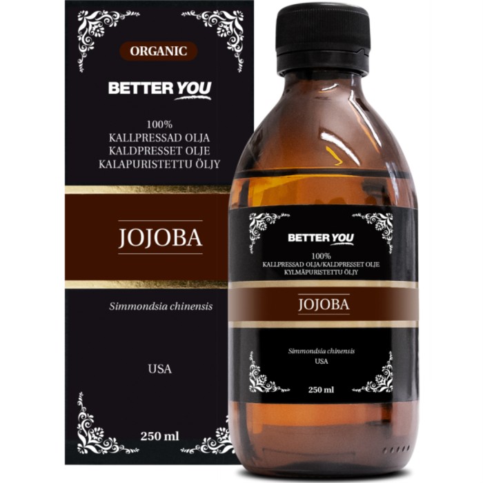 Jojobaolja (Simmondsia chinensis) från USA är ett flytande vax som extraheras från jojobafrön från Jojoba, en buskplanta som växer i torra områden i sydvästra USA. Jojobaoljan betraktas som en högkvalitativ basolja pga sin höga stabilitet och lätta textur. Den passar också bra att använda som bas för flytande, icke-alkoholbaserade parfymer. Better You jojobaolja är den oraffinerade gyllene sorten, vilket är den som har högst kvalité på oljan.