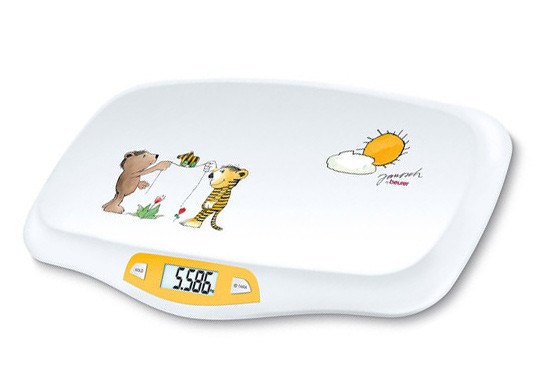 Babyvåg från Beurer med fint motiv av Janosch. Vågen har en skålformad platta som är enkel att rengöra och en tydlig LCD-display som är lätt att avläsa. Vågens pausfunktion gör att du kan pausa vägningen om barnet ligger och sparkar.