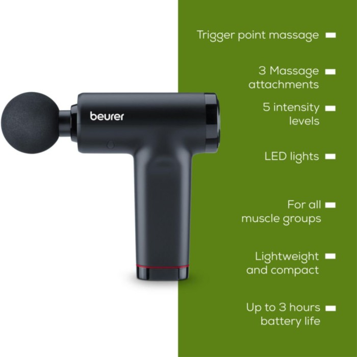 Beurer MG 89 är en massagepistol designad för riktad muskelmassage/djupvävnadsmassage. Den kompakta och lätta enheten passar för hemmabruk, eller att ta med på resor eller träning. MG 89 har en borstlös motor och är tystgående, vilket gör att den passar bra att använda i alla miljöer. Med flera intensitetsnivåer och högkvalitativa massagetillbehör kan du anpassa din massageupplevelse för att passa dina behov. Kan användas för att aktivera musklerna innan ett träningspass, eller för att regenerera dem efter träningen.