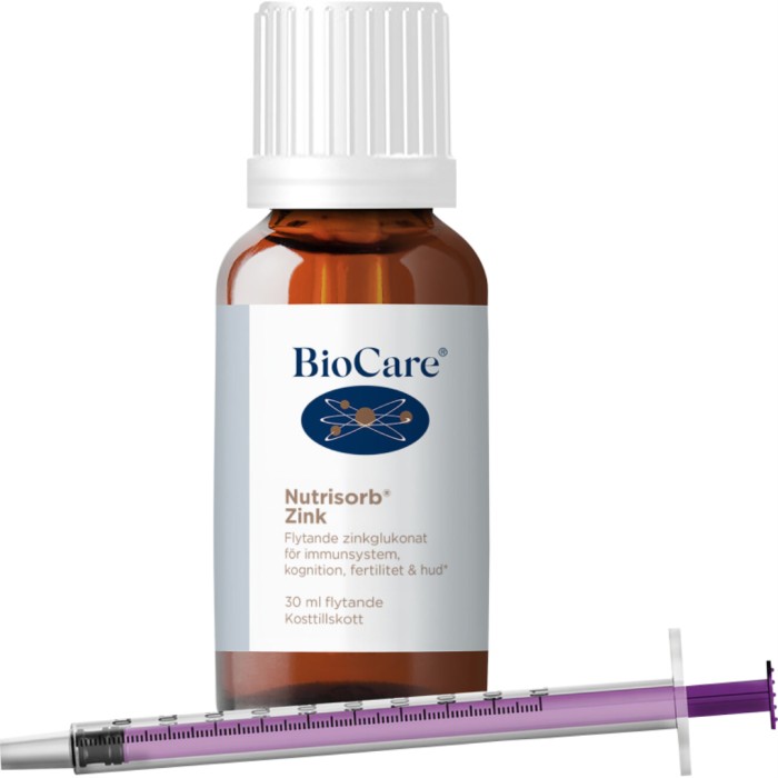 BioCare Nutrisorb® Zink är ett kosttillskott med zink i en vattenbas. Zink bidrar till att skydda cellerna mot oxidativ stress och bidrar till immunsystemets normala funktion. Zink bidrar till normal fertilitet.