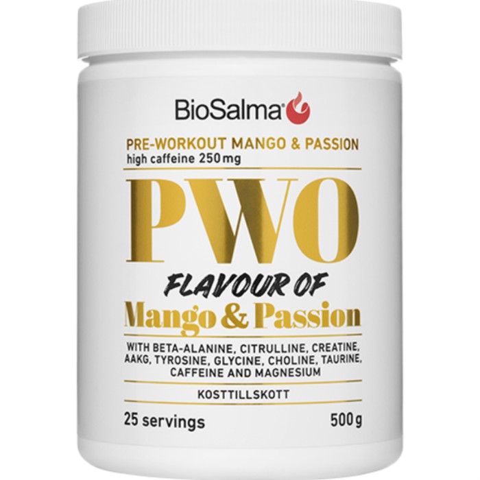 BioSalma® PWO High Concentrate är ett kosttillskott framtaget för dig som vill få ut mer av dina träningspass. BioSalma PWO innehåller en noggrant avvägd kombination av aminosyror, elektrolyter, koffein och kreatin – och har en fruktigt uppfriskande smak av mango och passionsfrukt. Innehåller sötningsmedel. Pulvret är lättlöslig och passar att ta före gymmet, konditionspassen eller intensiva sportaktiviteter.