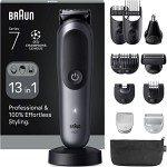 Groomingkit Series7 som Brauns kallar sitt bästa All-in-One Grooming kit för män. Detta 13i1-kit gör det enkelt att trimma skägg, öronhår och näshår, och klippa håret och trimma på kroppen. Med Ultra Sharp ProBlade för precision på alla typer av skägg med AutoSense-teknologin. Ger en exakt rakning och perfekta linjer med PrecisionShave-huvudet. Har 14 längdinställningar och AquaGrip för användning under vatten (vattentät). Har upp till 120 minuters drifttid med Li-Ion-batteri.