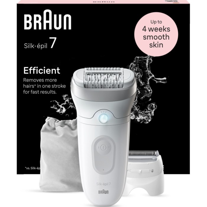Braun Silk-épil 7 är en epilator som ger upp till en månads slät hud. Denna epilator från Braun är en "Wet & Dry-epilator" (kan användas i duschen/badet) och har ett brett huvud som täcker stora områden och fångar in fler hårstrån i varje drag (jämfört med Braun Silk-épil 5). Denna sladdlösa Braun-epilator är utrustad med MicroGrip-pincetteknik som fångar hårstrån så korta som 0,5 mm. Extra komfort tack vare massagerullen som kan hjälpa till att minska smärta. Ett tips från Bruan är att epilera i badet eller duschen under varmt vatten, för minskad smärtkänsla. Förpackningen innehåller ett lady shaver-huvud och en trimmerkam för känsliga områden. Brauns epilatorer är tillverkade i Tyskland.
