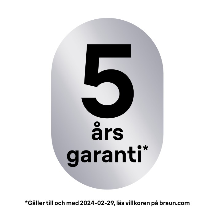 Du kan registrera din produkt hos Braun för att få 5 års garanti. (Se villkor och bestämmelser på https://se.braun.com/en/warranty-extension-se)