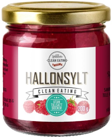 Clean Eating Hallonsylt är gjord utan tillsatt socker och innehåller 50 % bär. Sylten är istället sötad med sötningsmedel.