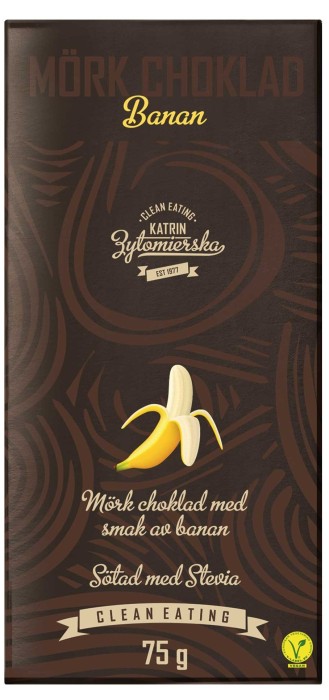 Clean Eating Mörk Choklad Banan är en mörk chokladkaka med smak av banan. Chokladen är sötad med stevia.