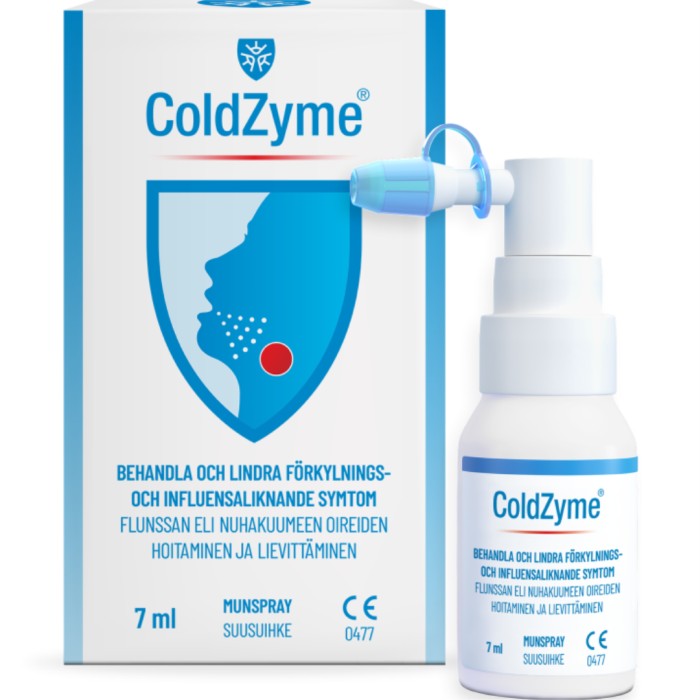 ColdZyme® är en munspray som skyddar mot virus som orsakar förkylnings- och influensaliknande infektioner i de övre luftvägarna. Munsprayen förkortar varaktigheten för förkylnings- och influensaliknande infektioner i de övre luftvägarna om den används vid ett tidigt stadium av infektionen. Den lindar också förkylnings- och influensaliknande symtom, inklusive halsont.