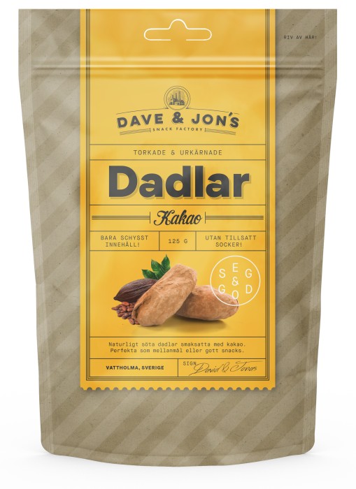 Dave & Jon's Dadlar Kakao är sega dadlar smaksatta med kakao. En helt naturlig snack utan tillsatt socker. Kanske ett bra litet tilltugg när du behöver ny energi eller vill unna dig något gott som inte är godis.