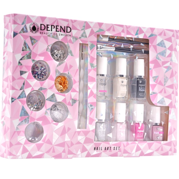 Med kitet Depend Nail Art Set får du en liten egen nagelstudio där hemma. Kitet innehåller nagellack, stickers, kristaller och pärlor - allt du behöver för att göra rolig Nail Art på egen hand.
