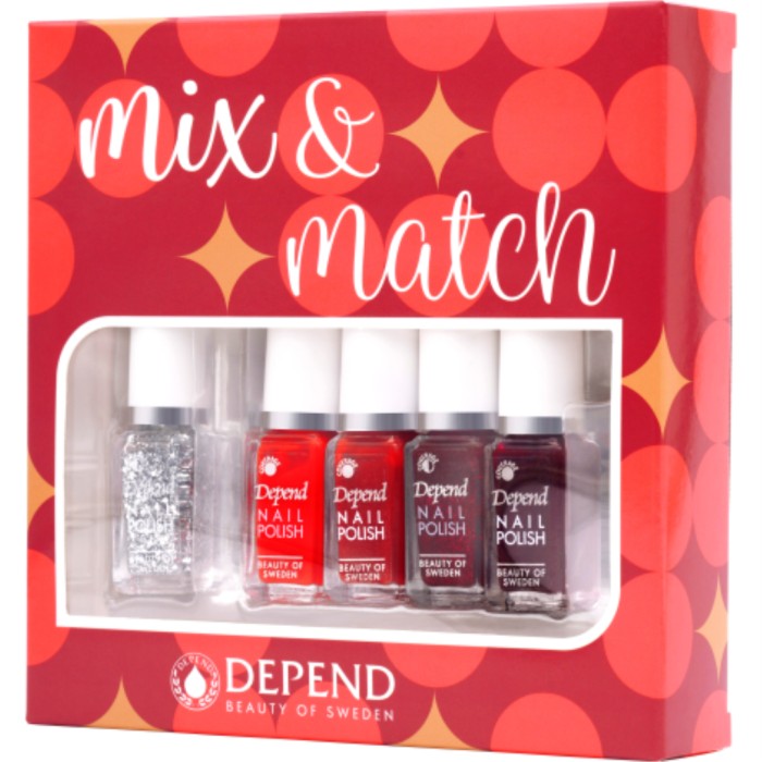 Depend Nail Polish 5-pack är ett gåvokit med minilack i julens klassiska röda och silverglittriga nyanser. Kitet innehåller även ett transparent lack med glitter i.