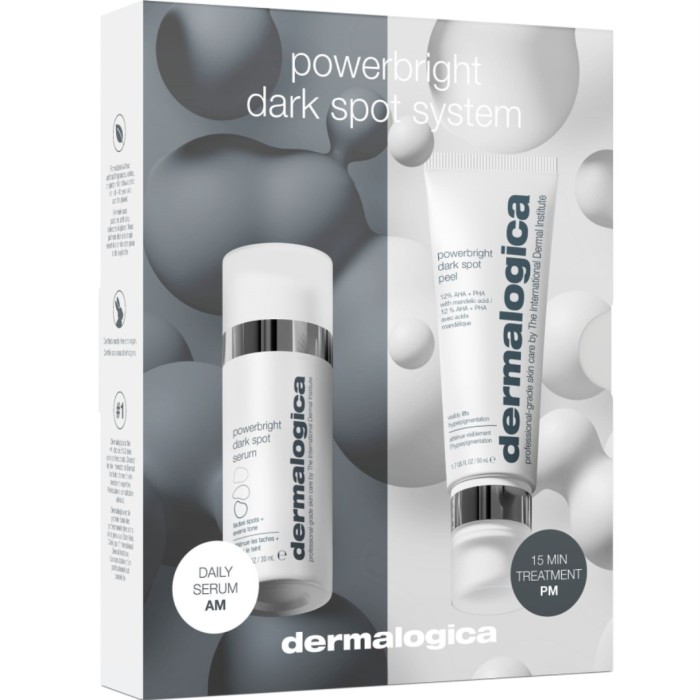 Dermalogica PowerBright Dark Spot System är en kraftfull hudvårds-duo som snabbt reducerar hyperpigmenteringar. Detta 2-stegssystem kombinerar ett serum för mörka fläckar + en djupverkande peelingmask som lyfter upp och stöter av hyperpigmenteringar för en jämnare hudton. PowerBright Dark Spot Serum hjälper till att reducera ojämn pigmentering över tid. PowerBright Dark Spot Peel behandlar effektivt ytliga pigmenteringar och passar alla hudtyper. Produkten är testad på olika former av hyperpigmenteringar och på individer med olika genetiska anlag för pigmentbildning.