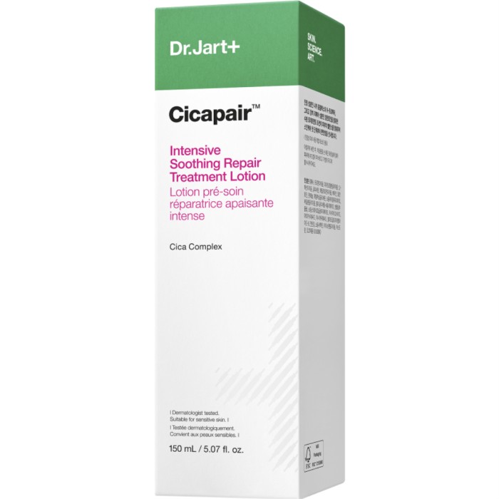 Dr.Jart+ Cicapair Intensive Soothing Repair Treatment Lotion är en lätt, essensliknande lotion med Cica Complex (Centella Asiatica-extrakt) som ger huden omedelbar lugnande fukt och minskar synlig rodnad. Lotionen har en lätt formulering som inte känns klibbig eller fet. Tränger in i huden för att balansera fuktnivåerna och göra huden synligt lugnare och ge lyster. Över tid hjälper lotionen till att reparera hudbarriären för en mer motståndskraftig hud.