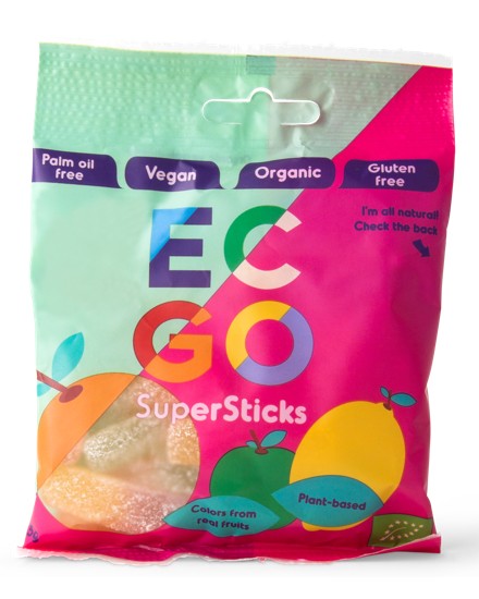 Ec-Go SuperPinnar är en av Ec-Go:s toppsäljare! Ett segt godis med smak av jordgubb, apelsin, citron och lime.