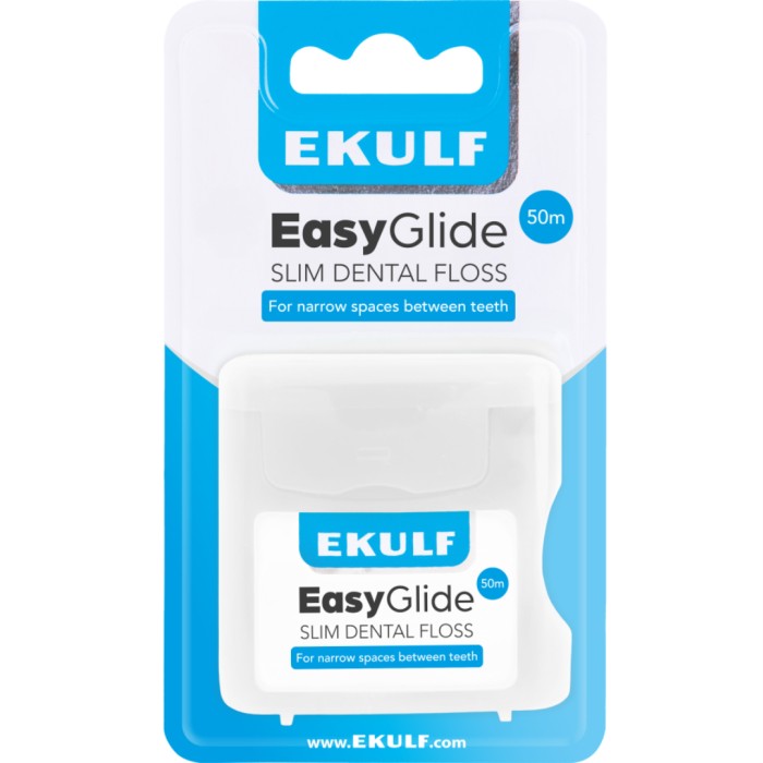 Ekulf EasyGlide är en extra tunn och smidig tandtråd, framtagen för att passa dig som har trångt mellan tänderna. Tandtråden är 50 m lång och behandlad med vax för att den enkelt ska glida mellan tänderna utan att skada tandköttet. Det starka materialet fransar inte, vilket gör att EasyGlide kommer ner djupt och effektivt rengör mellan tänder och tandkött, avlägsnar plack och bakterier för att bidra till en friskare munhygien.