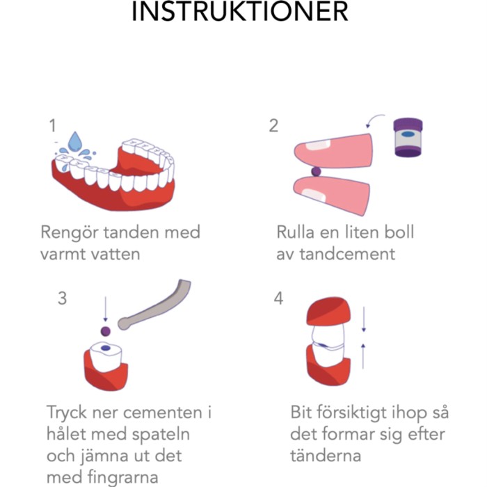 • För kronor: Rengör tanden och kronan med varmt vatten, applicera cementen i kronan och tryck försiktigt på plats.