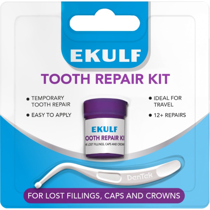 EKULF Tooth Repait Kit är en tillfällig behandling för att reparera förlorade fyllningar, lösa kronor eller inlägg. Tooth Repair Kit är utformad för att ge tillfällig lindring och skydd för den skadade tanden tills professionell tandvård kan genomföras.
