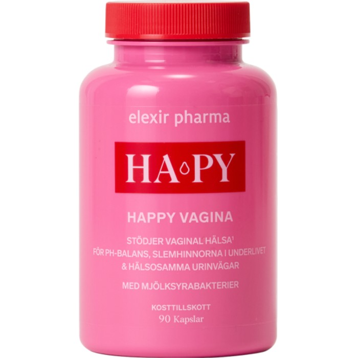Elexir Ha-Py (Happy Vagina) är ett kosttillskott som innehåller 12 miljarder mjölksyrabakterier från 7 olika, noga utvalda, bakteriestammar (per 2 kapslar). Elexir Ha-Py innehåller även örten Dong Quai, även kallad ”kvinnlig ginseng”, samt gullris, biotin och zink. Biotin är en B-vitamin som bidrar till slemhinnornas normala funktion. Zink bidrar till normal pH-balans. Happy Vagina innehåller även extrakt från ananas.