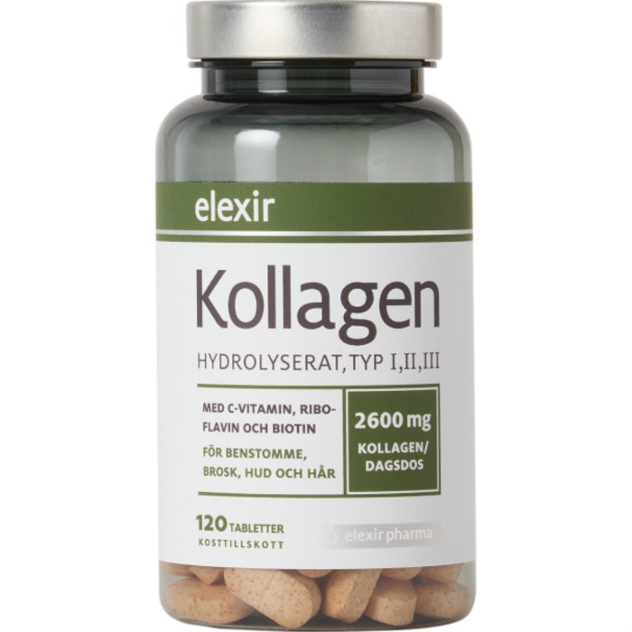 Elexir Kollagen är ett kosttillskott med proteinet kollagen av typerna I, II och III. Proteinet kommer från kyckling, nöt och fisk. Elexir Kollagen innehåller även vitamin C som bidrar till normal kollagenbildning och som har betydelse för broskets och hudens normala funktion.
