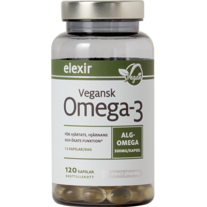Elexir Pharma Vegansk Omega-3 är ett kosttillskott tillverkat av alger och hela innehållet, inklusive kapseln, är vegansk.
