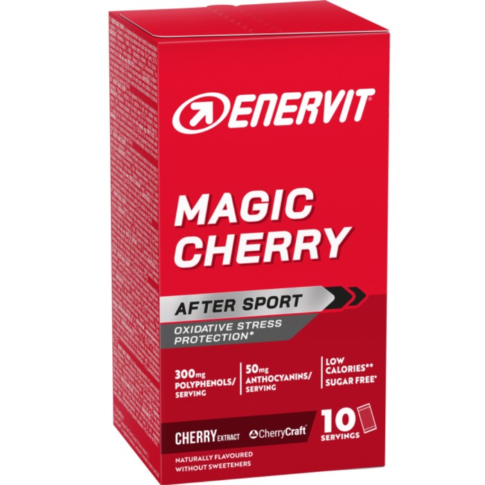 Enervit Magic Cherry 10 x 9 gram är en återhämtningsdryck i pulverform med en uppfriskande körsbärssmak, speciellt framtagen för att stödja återhämtning efter intensiv fysisk aktivitet. Varje portion (9 gram) innehåller en unik blandning av polyfenoler, inklusive antocyaniner, som bidrar till att minska oxidativ stress och påskynda återhämtning.