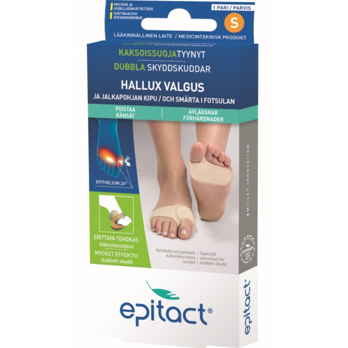 Epitact Dubbla skyddskuddar SMALL skyddar och lindrar friktion vid hallux valgus. Skyddsdynorna skyddar trampdynan och hallux valugs, lindrar smärta samt avlägsnar förhårdnader. Förpackningen innehåller ett par skyddskuddar.