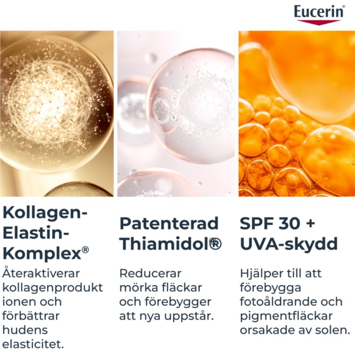 Denna dagkräm innehåller Kollagen-Elastin Komplex, en kraftfull kombination av arctiin & keratin, som hjälper till att stödja hudens egna produktion av kollagen och ökar hudens elasticitet. Ingrediensen Thiamidol® är kliniskt bevisad att reducera uppkomsten av mörka fläckar, med första synliga resultat efter 2 veckor. Formuleringen innehåller också hög- och lågmolekylär hyaluronsyra som återfuktar och fyller ut rynkor. SPF30 + UVA-skydd hjälper till att motverka hudens förtidiga UV-inducerade åldrande. Krämen bidrar till en synbart fastare och jämnare hud med mer lyster.
