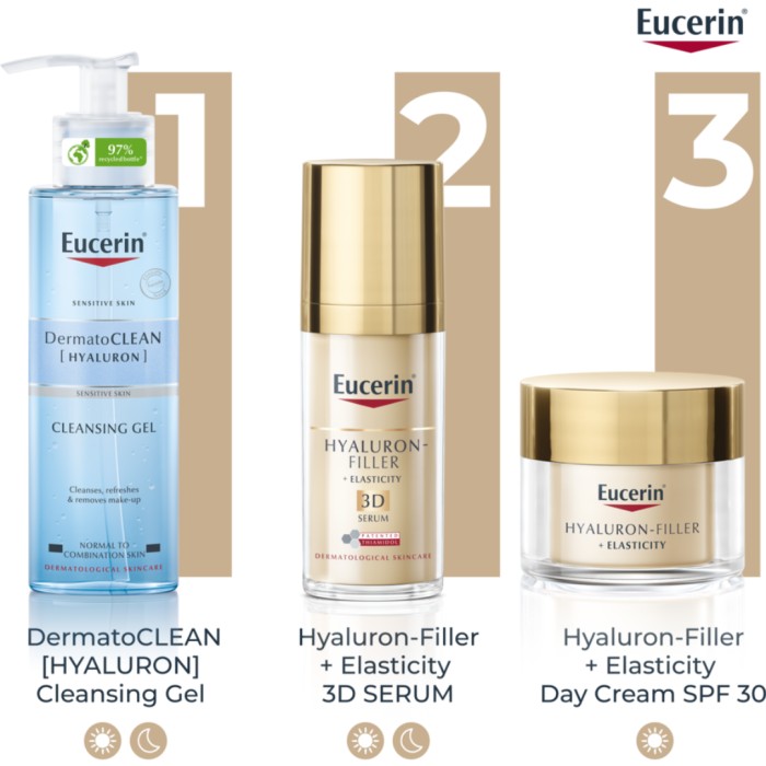 Eucerin Hyaluron-Filler + Elasticity Day Cream SPF30 är en dagkräm i refillförpackning. Krämen är framtagen för att minska synliga ålderstecken i huden.