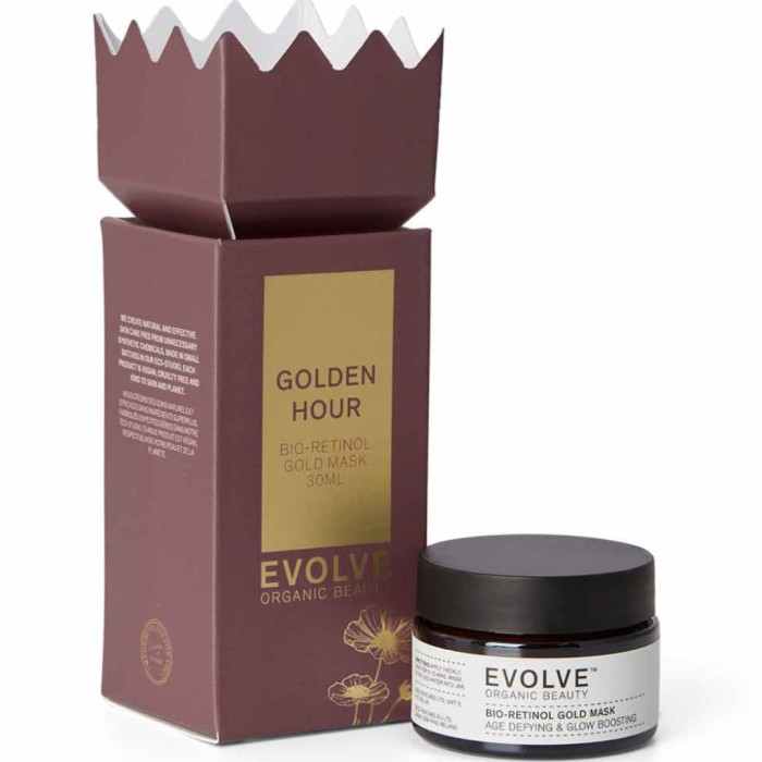Evolve Organic Beauty Golden Hour Cracker för dig som vill ge bort strålande lyster. Bio-Retinol Gold Mask är en snabbskönhetsmask som vårdar och ger huden lyster på bara 5 minuter. Den gyllene masken innehåller växtbaserad retinol och ekologisk arganolja, och lämnar huden fyllig, återfuktad och vackert strålande.