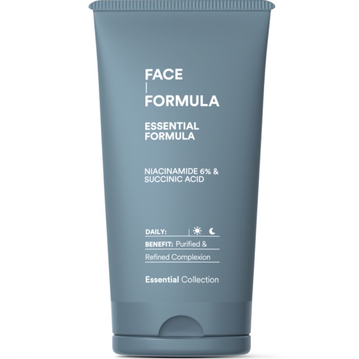 Face Formula Essential Formula är en unik gelkräm med en kombination av aktiva ingredienser som återfuktar, lugnar och förbättrar hudens utseende. Gelkrämen har en hög koncentration av niacinamid och jämnar ut hudens yta, reducerar rodnad och minimerar synlighet av porer, medan squalane ger långvarig återfuktning för en mjuk och smidig hud. Succinsyra har antioxidanta och lugnande egenskaper som skyddar och gör huden mindre irritativ, medan vitamin E motverkar fria radikaler och främjar en strålande hudton.