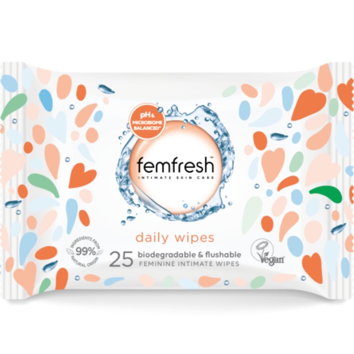 Femfresh™ Daily Wipes är våtservetter för intimområdet som rengör och ger en långvarig fräschhet. Servetten innehåller 99% naturliga ingredienser som extrakt av aloe vera och ringblomma.