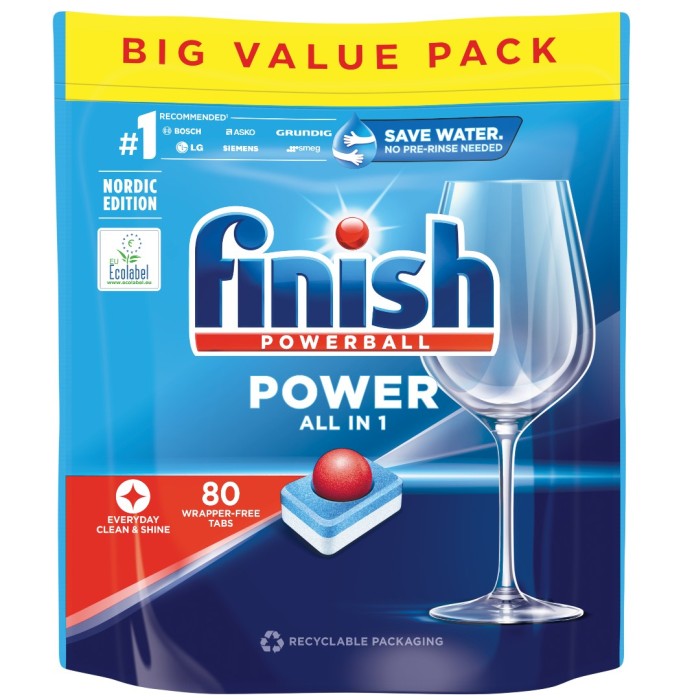 Finish Power All In 1 maskindisktabletter rekommenderas av flera ledande diskmaskinstillverkare. Maskindisktabletterna tar bort även tuffa matrester för att göra effektivt rent. Finish Power All In One är en powerball som löser upp och tar bort tuffa matrester även i hårt vatten. Samtidigt hjälper de till att skydda mot glaskorrosion så att dina glas behåller sin lyster längre.