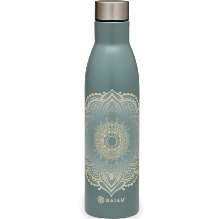 Gaiam Easy-Grip Bottle är vattenflaska i rostfritt stål som rymmer 740 ml. Flaskan har ett rostfritt lock och en bred öppning så att det går att få i isbitar.