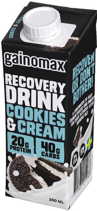 Gainomax Recovery Drink Cookies & Cream är en mjölkbaserad återhämtningsdryck med smakkombination av kaka, mjölkchoklad och vaniljkräm. En Recovery Drink kan tas efter träning. Drycken är förstärkt med protein och kolhydrater. Innehåller 20 g protein och 40 g kolhydrater.
