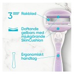- 3 blad för en nära rakning, och SkinCushion-smörjning som hjälper till att skydda huden mot irritation