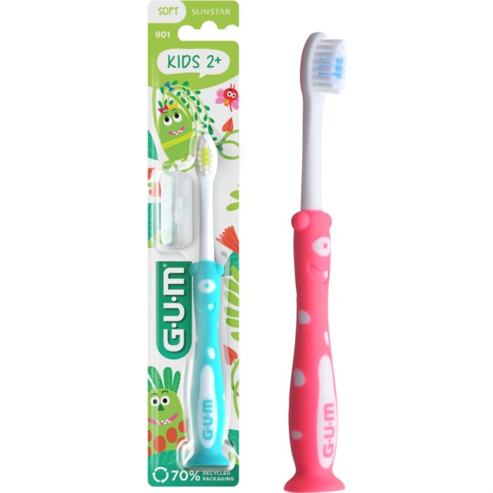 GUM Kids tandborste 2+ år är en tandborste speciellt framtagen för att förebygga karies och ta bort plack hos små barn. Tandborsten har ett extra litet borsthuvud för att passa barnets mun. De mjuka borststråna är klyvna för att ge en effektiv och skonsam rengöring för barnets tänder och vara skonsamt mot tandköttet.