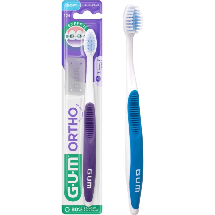 GUM Ortho tandborste är speciellt utformad för borstning av tandställning och har en mjuk borste.